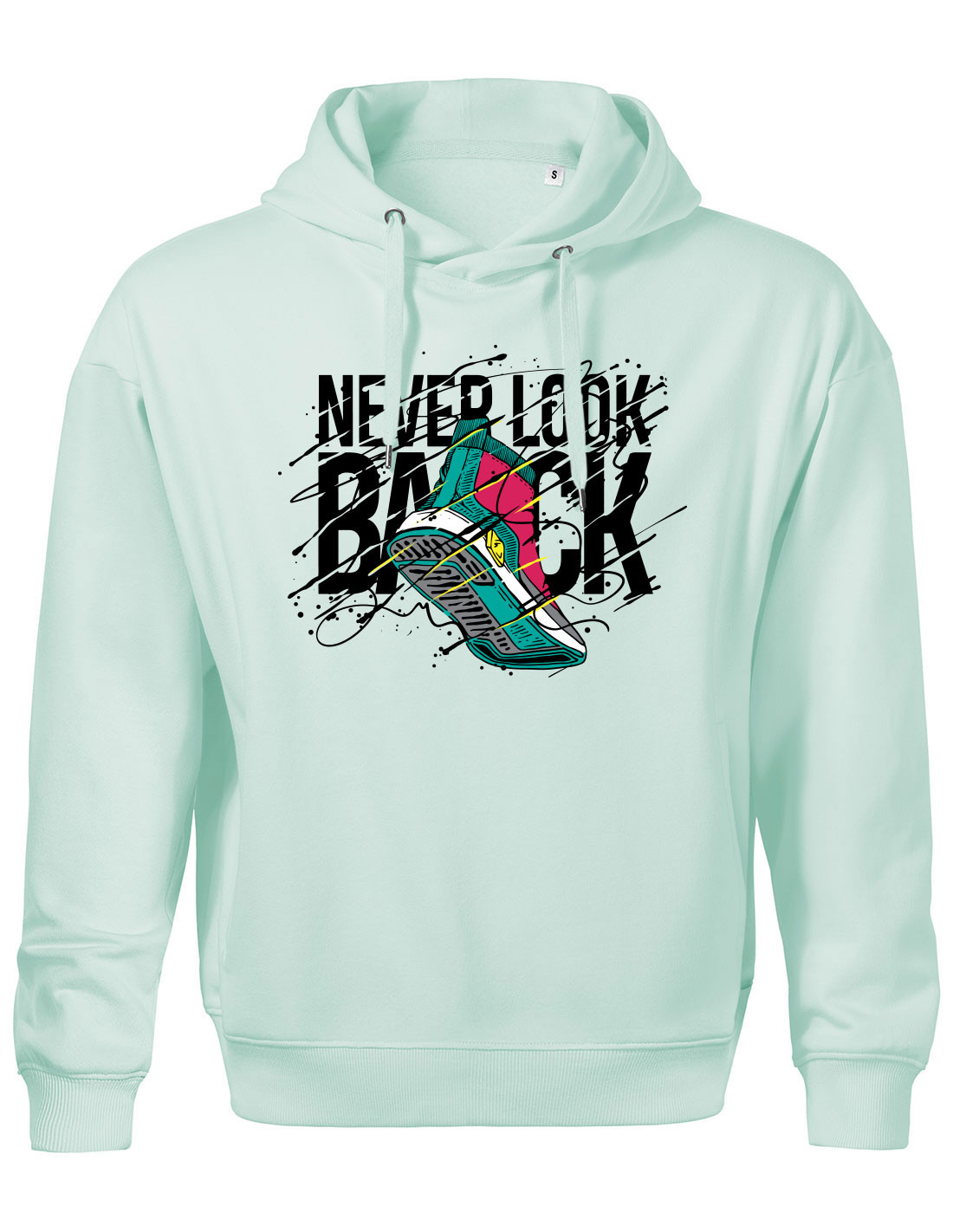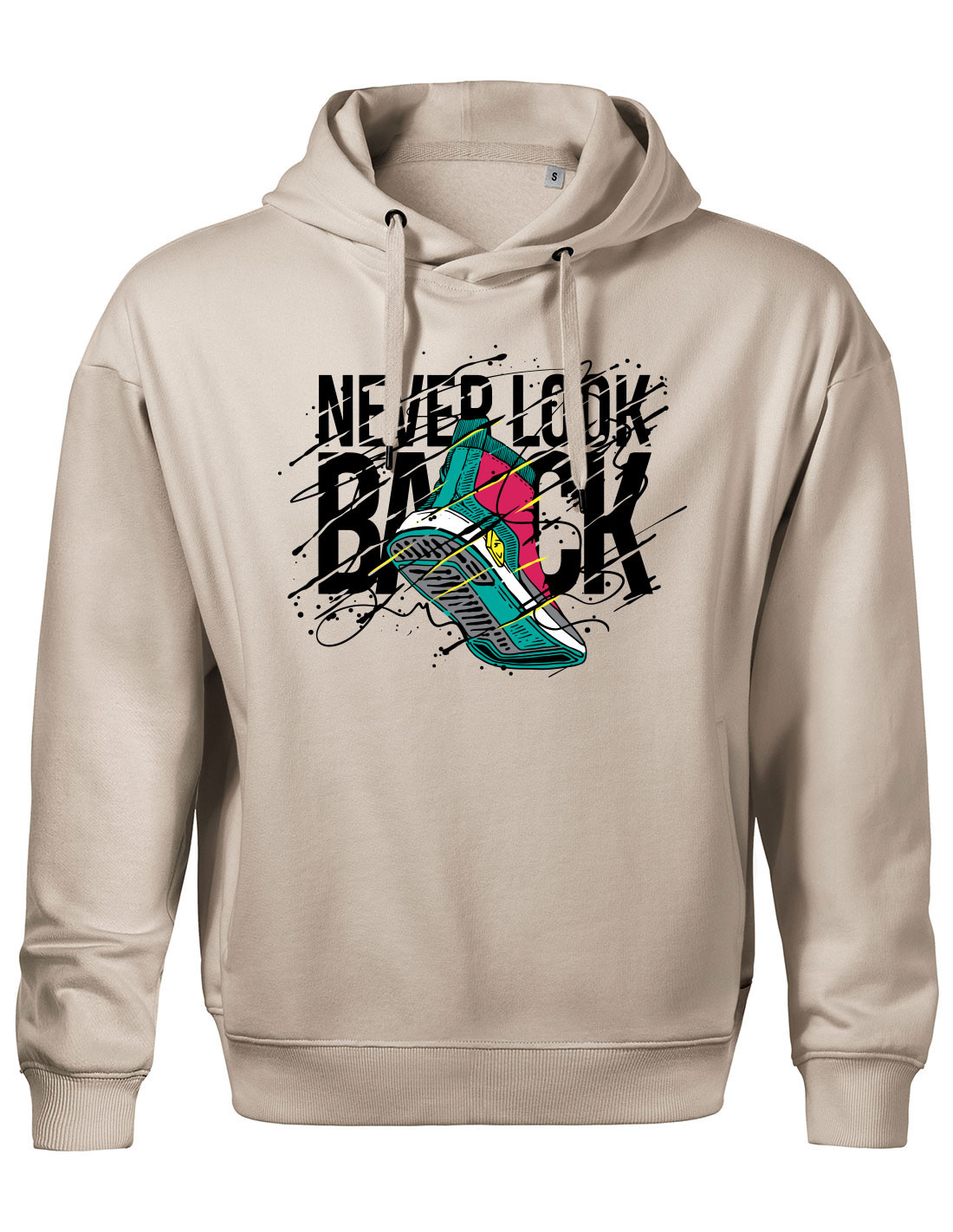 Grafika na mikine Never Look Back kombinuje typografiu, energické línie a kontrastné farby tak, aby okamžite pritiahla pozornosť. Dizajn je ideálny pre streetwear, mestský štýl aj každodenné nosenie.